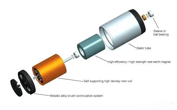 图中的有刷直流电机技术源自一种基于无铁转子(自支撑线圈)的设计,结合了贵金属或碳铜换向系统和稀土或铝镍钴磁铁。